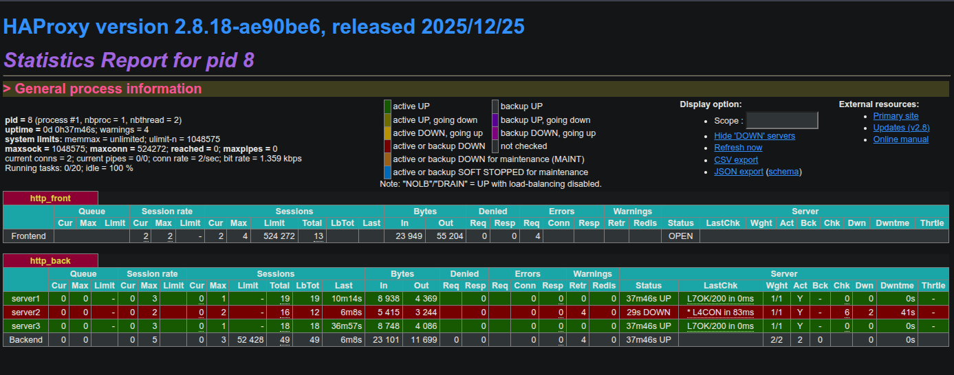 Untuk melihat status real-time tiap backend (UP/DOWN), jumlah request, dan hasil health check kita bisa akses dengan endpoint berikut